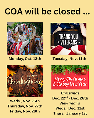 COA keeps the community informed on topics of interest to seniors and upcoming events each month. Being a focal point in the senior community allows the COA to function not only as a social and educational hub, but also as an information and referral base.