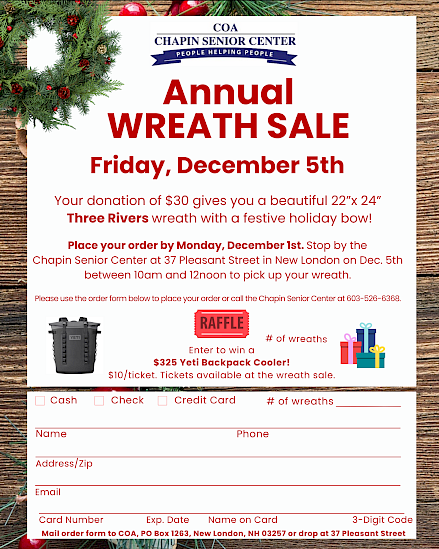 The Chapin Senior Center building will be closed on Friday, December 5th for the wreath sale