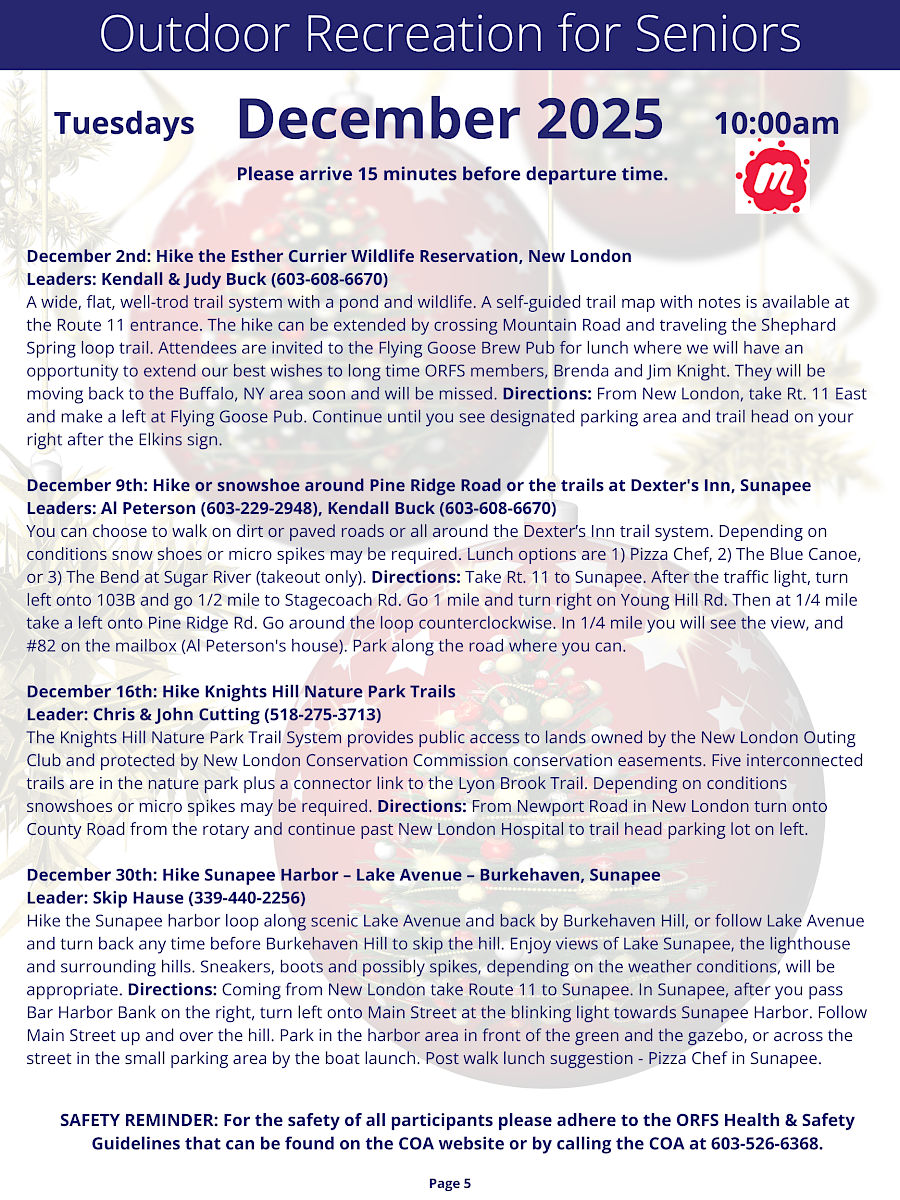 The Outdoor Recreation for Seniors (ORFS) group meets every Tuesday year-round at 10am. In the summer we kayak/canoe, swim and hike. In the fall we hike, and in the winter we snowshoe and cross-country ski. Our trips are from 1-1/2 to 2 hours, followed by lunch. ORFS is a very informal group and participation is for all outdoor enthusiasts wanting guaranteed good exercise with a friendly fun group. Join in on the fun. Hikes will depart promptly at 10am.